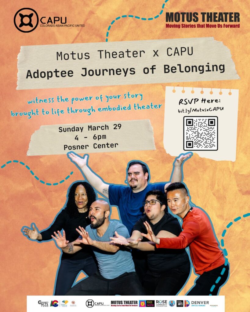 On Sunday, March 29 from 4–6 PM at the Posner Center, Colorado Asian Pacific United (CAPU) and Motus Theater will present an incredibly moving event: Adoptee Journeys of Belonging, an interactive Playback Theater experience centering Asian adoptee stories across cultures, generations, and identities.